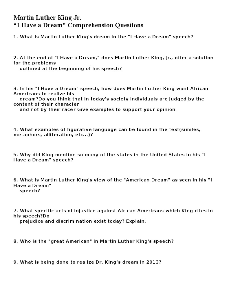Martin Luther King Jr I Have A Dream Comprehension Questions Martin Luther King Jr Society